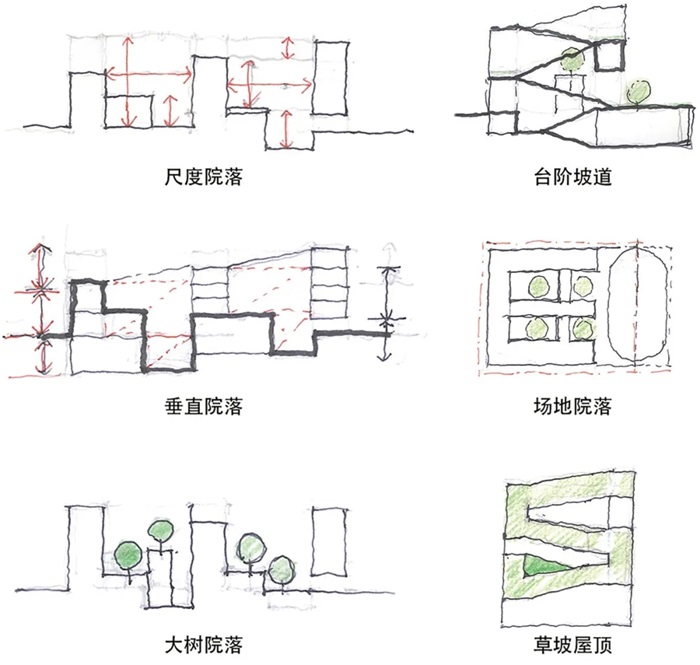 在设计形式思考的逻辑顺序上,屋顶草坡的想法产生于院落围合之后:一方面调控阳光遮挡和院落尺度,南低北高的体量提供了形式的机会;一方面为了打破田字形配置形成的围合感,建筑需要形成更有开放感的整体形式。我们开始思考屋顶草坡的高程策略:首先延续南北院落大树平台层层上升,大阶梯的流线顺着第4棵大树平台,继续上升到达4层屋顶;接着从建筑西南角4层屋顶的低点开始,如何可以缓缓上升到达建筑东北角的最高点的6层屋顶?