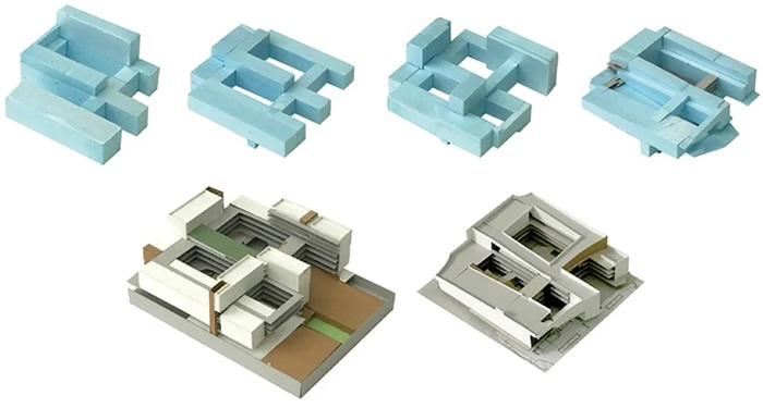 进一步思考如何形成院落的系统:如何形成整体与个体的群组关系?院落在围合的同时如何保持开放,如何与东侧的操场结合成一个整体?