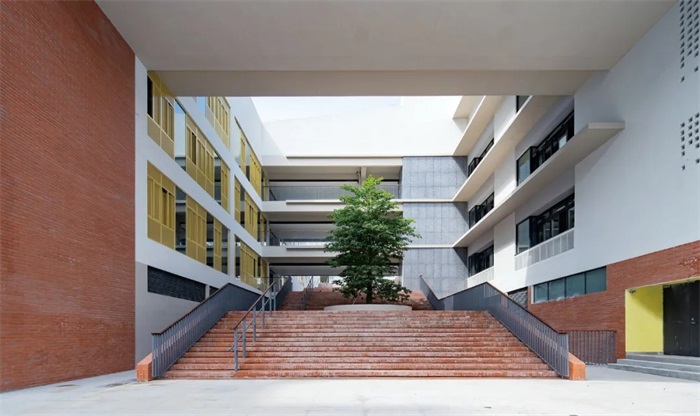 设计从建筑与自然交错穿插的剖面关系入手,在4个院落种植4棵大树,利用大阶梯将树池平台层层升高,把绿荫空间带至高层,形成三维的合院空间。设计利用院落的尺度、形式,整合垂直的功能划分:中层的教学空间从班级的学习单元开始,结合走廊平台形成班群;上层的图书展览空间,连接屋顶的草坡菜园,将校园延伸至自然;下层开放的地面连接下沉广场,为礼堂、体育馆的公共活动提供充足的采光。建筑师同时希望校园也是城市公共空间的一部分,未来成为深圳新一代市民的集体空间记忆。