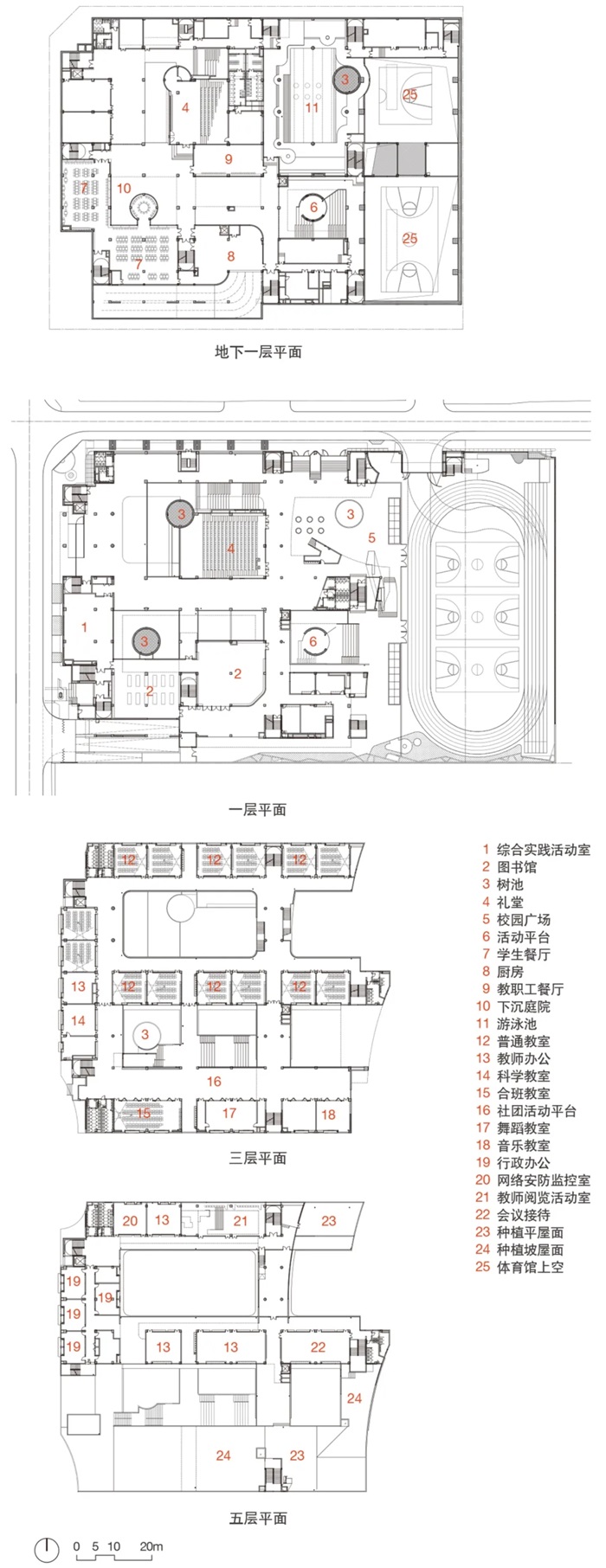 高密度的垂直校园,必须灵活地调控不同的公共活动层,功能的竖向分配往往重于平面布置。就建筑剖面来看,首先是地上6层加地下2层如何作合理的功能区位分配?然后是如何建立几个有尺度与场所感的公共平台?最后是如何在三维向度建立主要的校园通道,将这些活动平台联系起来?在竖向思考的框架下,石厦小学从地面层、地上平台、下沉院落3个策略层开始,安排平台的2、3、4层为普通教室;地下院落周边的1、-1、-2层为多功能礼堂、阅览和餐厅、游泳和体育;屋顶的5、6层为图书艺术、办公和活动草坡。