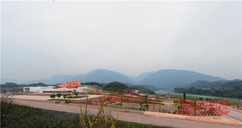 2)展示中心——围合向心同构:由于展示中心地处不同标高台地组合的地段,于是延续了当地处理这种地形的院落单元散点控制法,各功能单元体根据流线秩序,就近随台地布点,最终通过环形路径串接,围绕着一方相对开阔的庭院整合成一个具有两个层级特征的向心型空间体系,功能单元体为元语言级的方体;屋面则因循山势,成就为起伏折叠的斜面。