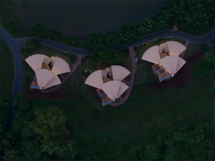 南溪树屋的基本单元以银杏叶为原型,结构形式类似叉状脉,由根脉出发向外均匀分散,承托起扇形的平面。与植物叶片上下之间适当错开以获得更大受光量类似,树屋在不同高度设置了错落有致的客房单元,大致朝向主要景观面但角度各不相同。各单元的结构和空间相互独立,既呈现自然有机的状态,也避免了大悬挑钢结构的微小颤动带来干扰。
