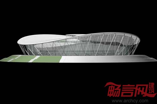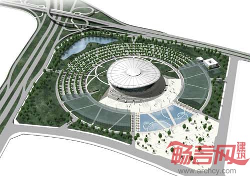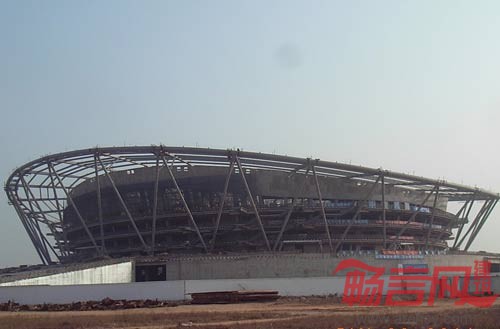 体育馆外形为倒锥台几何体,顶面为马鞍面,投影为直径约160M圆形;顶面的大截面圆钢管外沿环,象征着篮球架的篮框;倒锥台侧面有三角形网眼的三向网格曲面幕墙象征着篮框下面的篮网,更体现了篮框的隐喻形象。该项目目前处于上结构施工阶段,计划于2011年9月竣工。