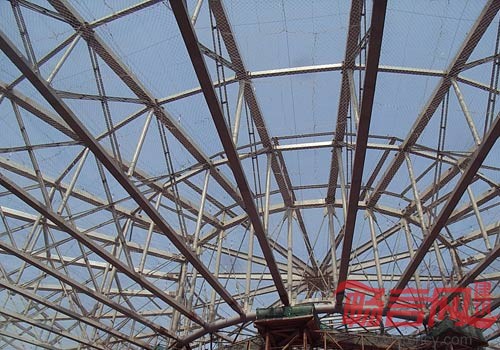 径向桁架采用单向斜拉杆的三角桁架,这也是本工程钢结构的一大特点,截面最高10m。上弦构件截面为腹板上伸的箱型截面500(H)x600(B)x10~50,便于屋面天沟的安装;下弦构件截面为箱型截面300(H)x500(B)x12~30;竖腹杆为Ø273x7.1;斜腹杆为Ø65的钢棒。外环梁钢管Ø1016x30,外围V型支撑柱Ø610x25,幕墙环梁Ø711x45。
