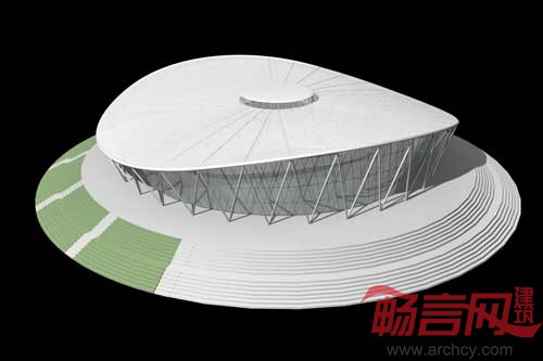 屋盖结构平面直径约为160m,外环呈马鞍形。外环高度为16.64m到26.79m,内环最大高度27.22米。屋盖结构由外环的28根落地V形柱和位于直径119.76~128.22m近似椭圆上、落在主体看台上的28根斜柱支承。屋盖由3部分组成:内外两排柱之间的径向单跨梁(跨度15.165~19.39m)、跨度44.88~49.11m的平面桁架、直径30m(高度10m)的内环及其屋盖。屋盖的实际跨度为平面桁架和内环跨度之和,即119.76~128.22m。屋盖结构形式可以看成是桁架、梁和悬吊屋盖的组合。为保持屋盖结构的整体稳定性,径向构件(结构)之间用刚性檩条连接,檩条间设水平交叉支撑。为保持内环结构的水平刚度,在内环下弦平面设置交叉拉索。