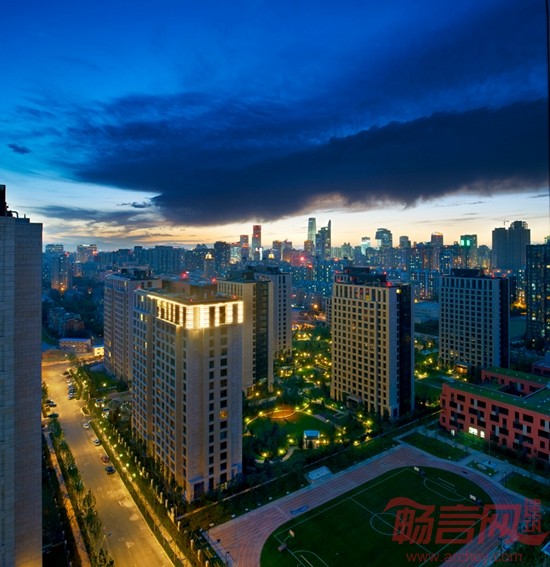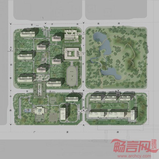本地块以时价“地王”引起媒体关注,地面价格高昂。籍借“L”形的地块特征,形成南北向和东西向的双轴线规划格局。以南北为轴线,豪宅区采用对称形式布置楼宇,以示高贵壮丽;再现传统北京城市空间格局的工整大气。以东西为轴线,贯穿体育公园和商业广场,充分营造休闲都市生活氛围,点燃城市激情。分区明确而浑然一体。设计本着景观最大化,绿地最大化的思想,住宅区整体地坪抬高1.5米,在经典花园豪宅区中塑造了罕见的完全步行化的近三万平方米的社区中央公园和两万平米的体育公园。