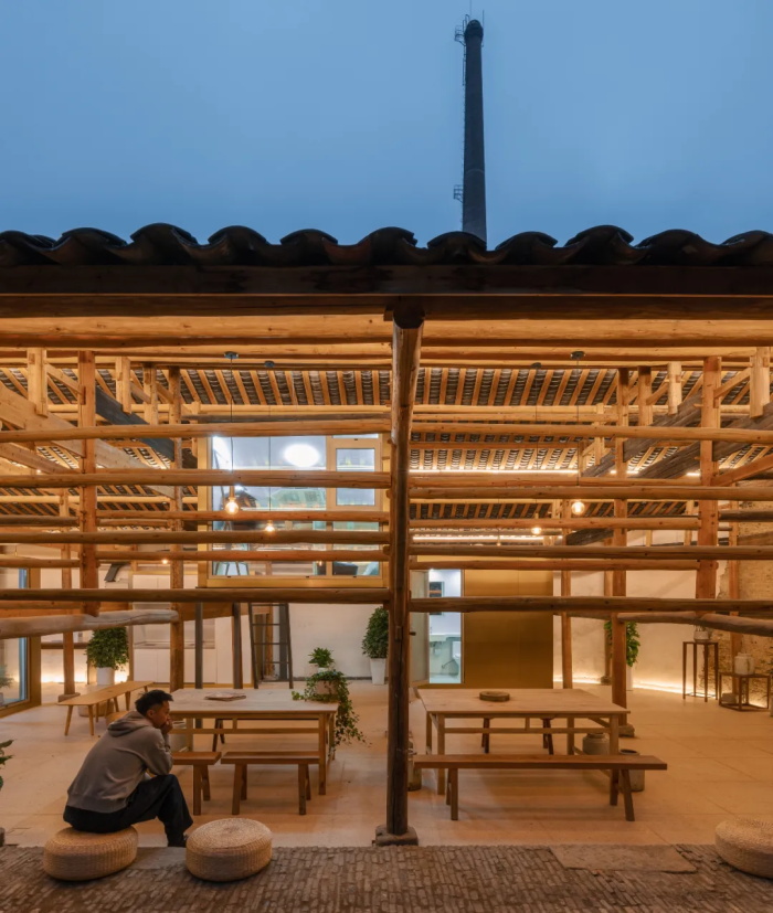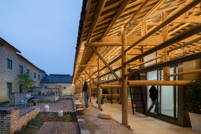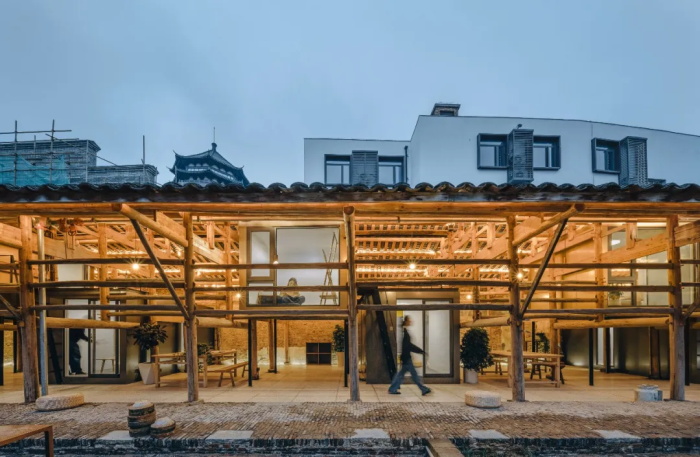 场地位于景德镇陶阳里历史街区,以明清御窑厂遗址为中心。历史上这里是皇家御窑,明清时期“官搭民烧”的城市格局渐渐形成,官窑周围分布了大量的民窑。窑房和坯房非常密集,一般会在一到两个窑房周围建设十栋左右的坯房, “一窑十坯”是该地区历史肌理的重要特色。坯房插件家是众建筑面对景德镇典型的坯房建筑更新所采用的一种预制化模块系统,通过在坯房的复杂屋架中置入多种功能模块,来形成新的院落空间,是一种可逆化的改造方法。