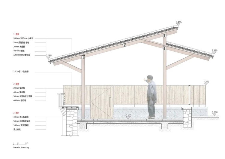建造的过程中,我们要求用当地的匠人参与建造,干一天活给一天钱,他们会用匠人精神把活干好,每天做多少算多少,做完工地的活就回家干农活了,不指望着赚多少钱,这样才能把活干好。看乡村匠人干活能感受到什么是真实建造,砌石头墙每块石头都要挑过,顺应其形态择其位置,下大上小,自下而上,真实的受力关系和建造逻辑,同时保留手工建造的痕迹和时间的印记,强调建造的真实性。建筑结构用的是施工比较方便的钢木结构,其结构逻辑与村落中传统建筑的构成逻辑相似,结构与外围护墙体体系脱开,用连接点将结构与外墙体连接。