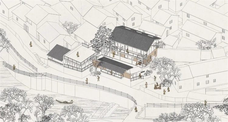 在村落中行走,随着地形的高低变化,民居的体量大小变化,方向的偏转,屋顶的边界关系呈现出来一种错落有致,变化无穷的状态。这种状态希望在设计中呈现出来,以呼应当地建筑屋顶形态的变化关系,所以建筑的体量被打散分解重构,屋顶方向斜度变化,形成与原有村落民居和谐的屋檐关系和体量关系。
