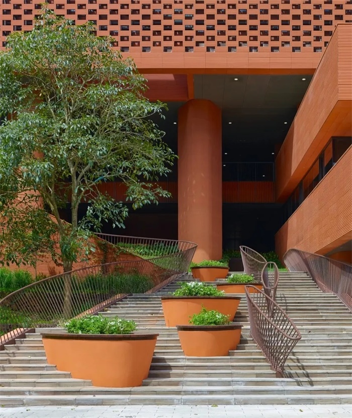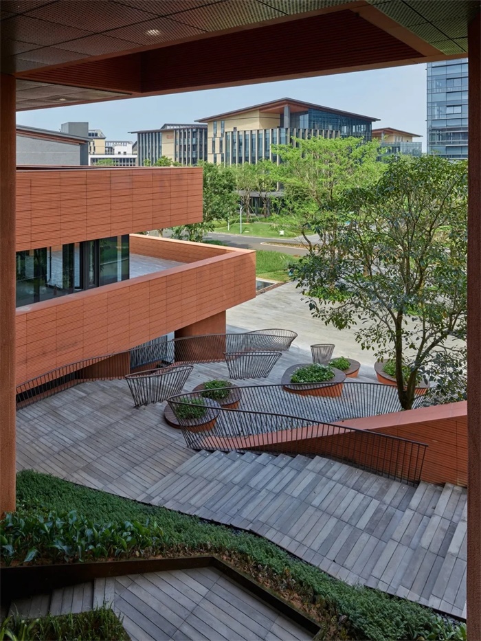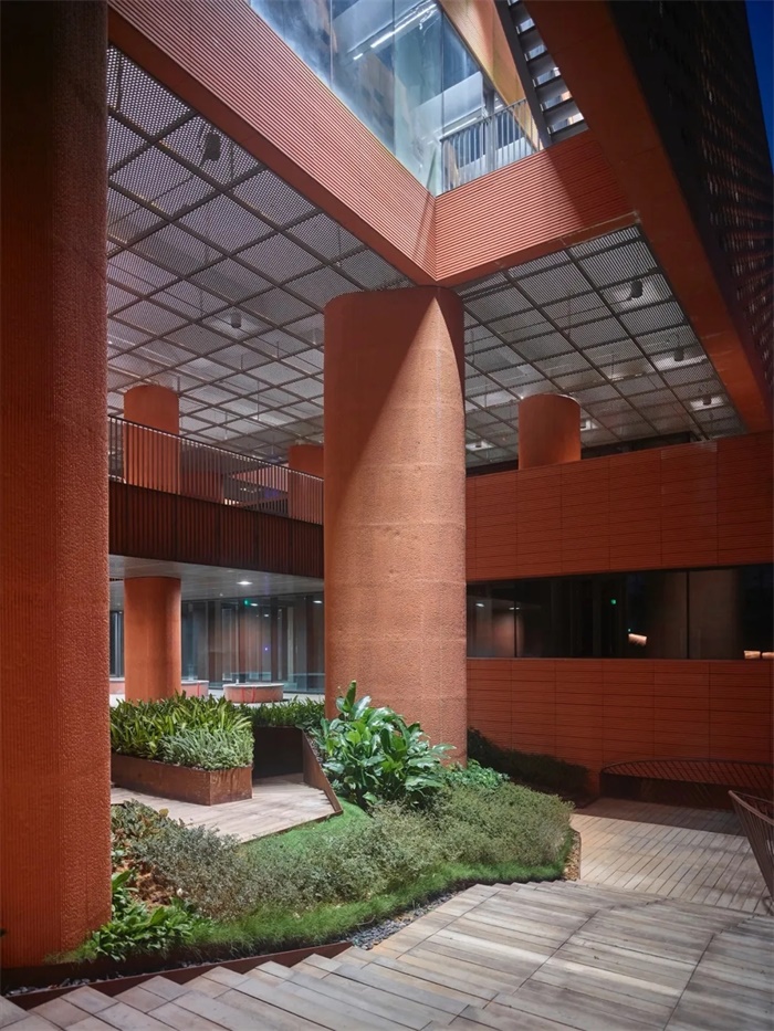 半室外通高中庭、平台、庭院和巷道,与层层梯田结合,从首层到顶层,成为完整贯通的室外公园式景观体系,与室内建筑功能区域既处处连接,又相互独立,形成了一座承载现代功能的立体游园。