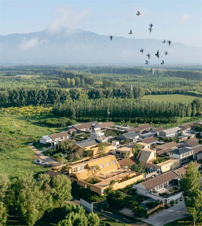 ARVO 16:30 酒店项目位于马营村边缘的西北角,与村外山野一路之隔。这次我们收起以往设计中的一丝跳脱,没再试图给山谷停一座飞船或者在大地上画匹大马,而是模仿隐入自然的马营城堡,将村中几个院子归整到一处,也搭一座城堡,在里面接住探出围墙的树,外观上看起来几乎完全融进村庄场景。淡黄色的建筑和村里老玉米的中黄、夯土城堡的土黄深深浅浅地同色辉映,让建筑充分接纳村庄的原有生活状态。