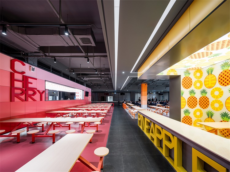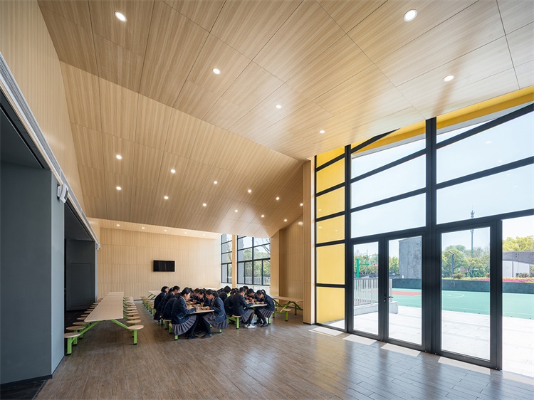 在教学空间的设置上,在基本的公共教室和实验室之外,首层还设有阅览室、音乐报告厅、艺术沙龙、舞蹈室、美术教室、书法教室、专家交流中心、校史馆、画廊等功能。并且各个功能被有机的结合在一起,以院落为中心集中布置,形成知识之院、科技之院、人文之院、艺术之院等主题空间。与此同时,为了整体打造校园环境,设计从空间结构、人造物与自然物的角度出发,将建筑、室内和景观融合在一起,达到一种“浸润式”的教学空间体验。