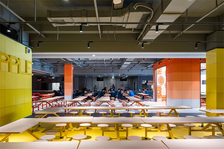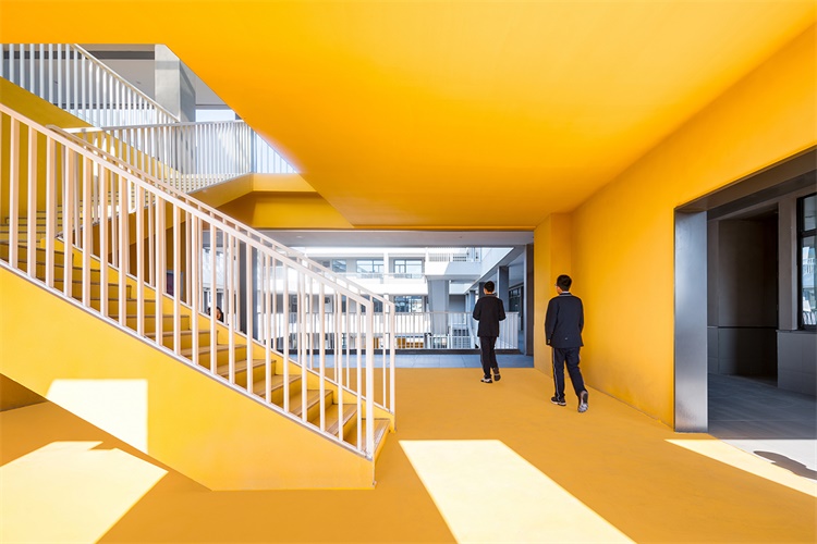 此外,设计在教室与地面集中活动场地之间创造了中间层级的活动场地,让课间短暂的时间也能让学生充分玩耍。把教学楼和宿舍楼局部的体块掏空形成半开放的活动空间,将掏空与开洞这种二维的建筑元素增加了一维,表面上看是把原有的实体空间减少了一部分,实则掏空的部分成为了学生课外活动、接触自然的场所,增加了整体空间的丰富程度,反而达到了100-1=101的效果。并且,活动空间被设计为统一的明黄色,配合午间阳光的光影效果,为校园增添活力的同时增强辨识度与归属感,促进学生们的沟通交流。