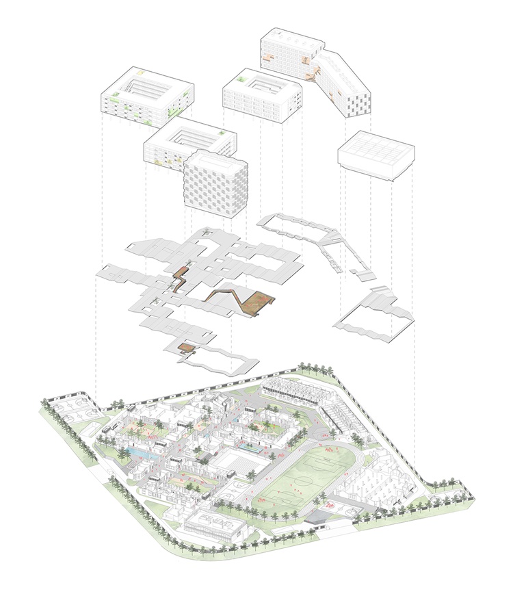 聚焦这一问题,设计首先对学校的功能和体量进行分析,并整理出每一个教学单元和空间模块,然后将各个教育用房单元根据自身所需的日照、采光、通风以及朝向条件进行合理高效的布置和摆放。公共教学用房以及校园公共空间铺开布置在首层,以使校园公共活动更多的在首层发生;教学楼、宿舍和风雨操场等建筑体量布置在二层及以上,以保证良好的日照、采光和通风。这样的布置的策略是将大量同质化的教学单元集中布置,将节约下来的土地空间留给公共教学单元和公共空间,这也与新世纪外国语学校的小外交官教学体系高度契合。