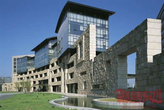 设计理念:坐落于上地核心区的环洋大厦,旨在为员工打造远离城市喧嚣,并具浓郁中国文化特质的企业总部。设计团队以长城作为设计灵感来源,采用大体块毛石作为基本建筑材料,并在中国人对“墙”的惯有理解基础上融入了老北京四合院这一地域性元素,打造了风格独特、极具艺术气息的建筑立面。