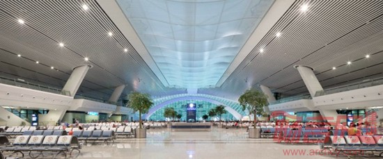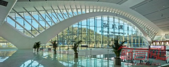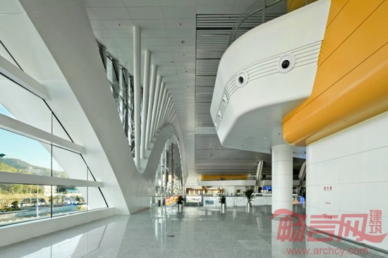 旅客进入宽敞明亮的进站广厅仿佛一下子离开了喧嚣的城市,层层叠叠的丰富空间迭次展开,如同热情好客的厦门人精心装点的城市客厅。随着扶梯的升高,映入眼帘的是接近纯白色的候车大厅,空间纯净、开敞、灵动、亲切。大厅中内倾的斜拉坚实有力而轻巧的柱子与宏伟简洁的拱顶完美结合,不仅避免了直拉的呆板,还大大减小了顶部网壳的跨度,是结构受力与视觉审美的高度统一。候车大厅两侧如船舷般漂浮在空中的商业夹层挑台舒展、轻灵,完全打破了候车大厅两侧的空间界面,代之以层次丰富的空间延伸。