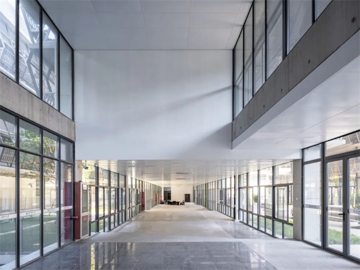 进而,我们打破建筑的封闭性,为单体建筑设计了从中心向边缘的四层空间:中心庭院(室外)、空调区(室内)、廊下(半室内)、檐下(半室外),后二者可视为绝对室内与绝对室外之间的过渡,即灰空间。由悬挑屋顶覆盖、进深10米的檐下空间继承了中国建筑木构深檐的传统,赋予了建筑单体一个伞形的剖面。