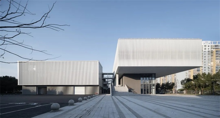 如何利用此次建设的契机,既解决目前急需的电梯实训场地,同时还能为学校未来发展预留出空间,设计需要来一次空间谋划。最终在场地中形成了两个长条状建筑并列的布局,建筑之间是一个带状的下凹式景观内庭院作为雨水花园,庭院内种植喜阴、耐湿的水杉树。西侧靠学校内侧的长条状建筑是电梯实训车间,东侧临街的长条状建筑是复合共享实训平台,作为封闭校园对外的窗口,建筑鼓励与校外企业以及社会机构之间建立更紧密的联系,体现出教学融入市场、教学服务社会的需求。