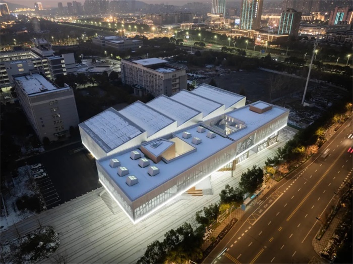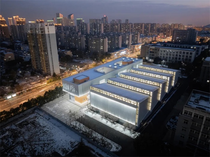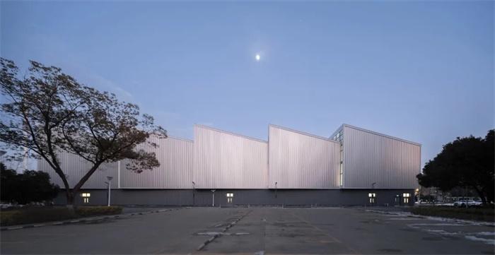 电梯实训车间采用钢框架结构,为了尽量增加大跨度下的室内净高,设计利用了屋顶锯齿形采光天窗的高度来设置桁架梁,天窗带来的北向恒定采光满足了大空间的自然光照,也实现通风换气的要求。在建筑的西立面,天窗一直延伸到墙面并成为侧窗。在外立面铝镁锰金属板的衬托下,整个建筑看起来像 4 个相互嵌套的金属盒子,形成了独特的视觉印象。