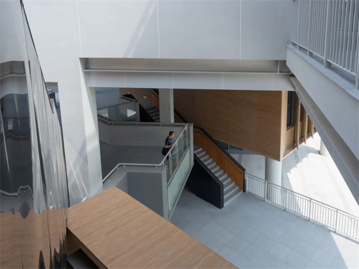 这个全新的实训建筑,就像是一个码放一堆“箱子”的货架,一二层的“箱子”三三两两堆放得较为松散,而中部的“箱子”还特意扭转了一个角度,使得这个“货架”充满空隙,让建筑四周的场地空间相互渗透。第三层的建筑形体是一个出挑的“大盒子”,这一层由三个高大空间组成,其中两个作为实训场地、一个作为学术报告厅使用。整个三层的建筑外墙表面被上下渐变的瓦楞穿孔铝板所覆盖,在形成引人注目的城市标志形象的同时也有效的调节了东西向的光照。为了顺应城市道路的走向,“大盒子”在东南部的出挑逐渐增大,这些造型出挑为下部的出入口周边创造出一圈有遮蔽的场所。