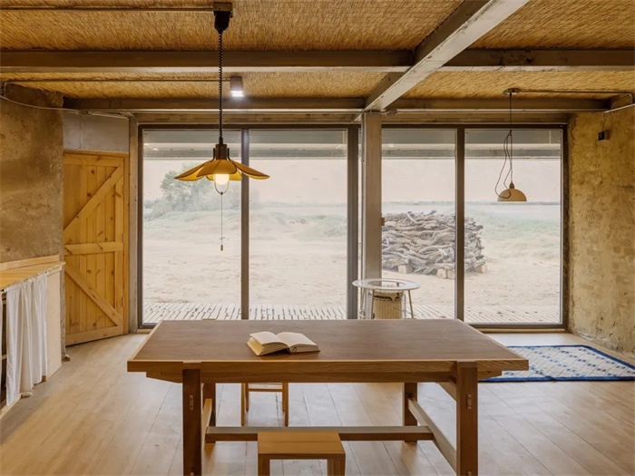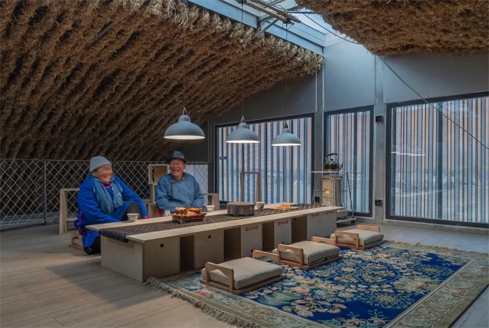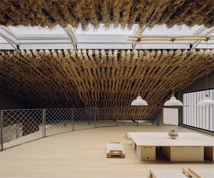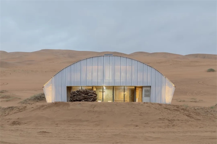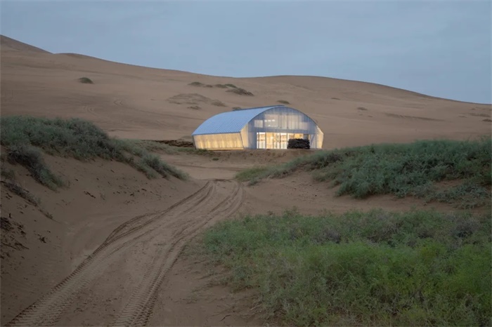 通过对当地遗留的芦苇房、梭梭棚屋等既有乡土建筑设计智慧的学习,就地取材,发掘当地草泥型建造技艺。芦苇编织拱形钢桁架屋顶的设计灵感来源于沙漠中一处失落的蒙古包群,设计创新性地将乡村常见的拱形钢桁架、方管、金属屋面板等现代材料与木椽子、草绳等自然材料结合起来使用。