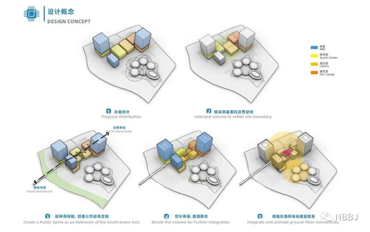 业主的主要目标是确保设施和租户空间组合满足张江地区不断增长的人口需求。与此同时,他们渴望创建一个能够同时吸引上海其他地区新的访客、租户和居民的目的地。项目设计理念通过整合邻近的艺术综合体并将自然元素引入整个空间,从而模糊了人工智能园区和外部社区的边界,以呼应并烘托场地环境。