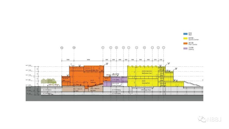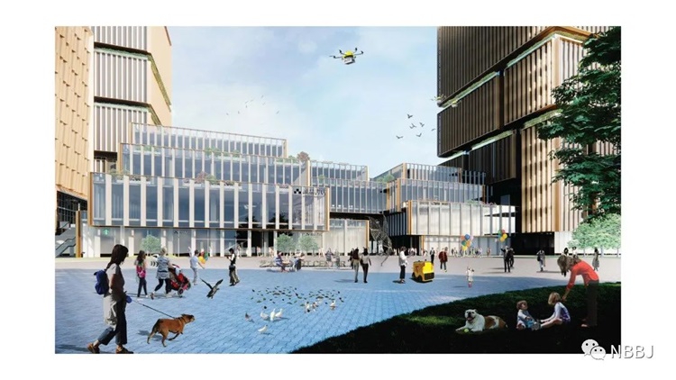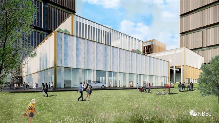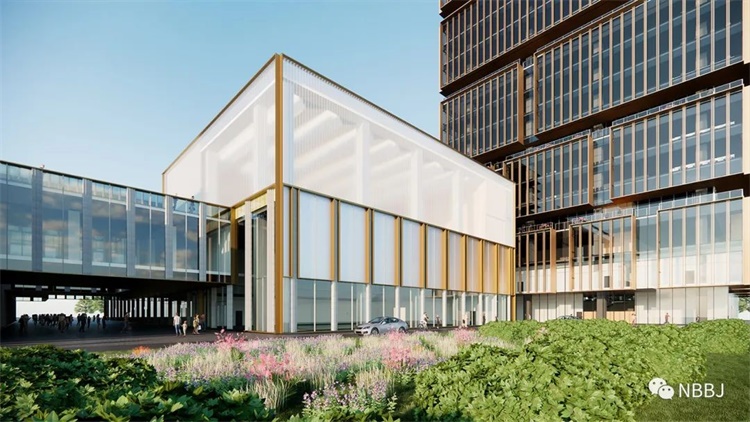 社区共栖的概念是使租户及更广泛的社区都能使用休闲设施和各种配套服务,促进健康、文化和康娱的发展。裙楼被分解成多个“盒子”,每个盒子都呼应着一个特定的功能需求。园区将提供演艺场所、社区体育健身,图书馆以及多种生活方式选择。演艺中心的白色丝印玻璃与体育中心的编织金属网立面形成了微妙的对比,并与图书馆和艺术展览空间所在的玻璃盒体形成了进一步互补。每个空间都被赋予了一个独特的身份形象,由此来界定三座办公楼的主打特色,并在美学和建筑功能搭配层面打造出一个目的地。裙楼屋顶引入一座优美的空中公园,为园区租户和访客提供了开展快闪式展览、服务配套和协作交流的机遇。
