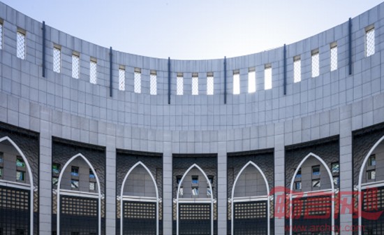 设计运用现代手法,强调整体的富有雕塑感的体量,设计构思来源于对伊斯兰和中国建筑文化特征的提炼,体量简洁,内向丰富,通过简化外部体量关系,突出以水池为中心的内部庭院交错的特色,整体上与传统伊斯兰建筑的空间特征相呼应。白色石材底层落地,与底层落地窗形成强烈的虚实对比,青铜色金属幕墙外皮浮于白色石材建筑体块之上,完整统一,气势雄浑,形成了中国鼎的意向。红色和黄色的剧场及音乐厅体块从青铜色金属外壳中伸出,简洁轻快的色调与带有浓厚文化色彩的青铜色形成对比,使得艺术馆建筑成为赋予城市空间的活跃氛围的现实载体。