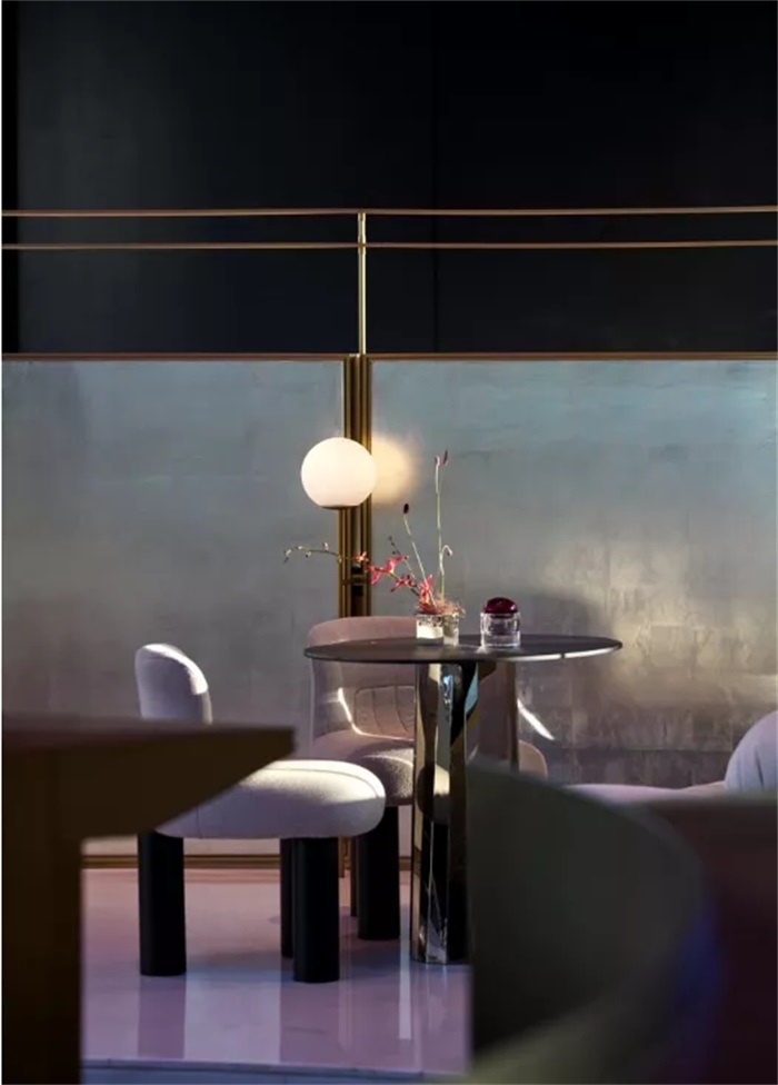 建筑的中心区域部分是社交核心。该空间下沉1.2米去强调休闲区与其他功能空间的转换,同时也能提升天花的尺度感。软装遵循硬装的色彩分布逻辑,整个下沉区用纯净的白色系铺展开来,用丰厚的尺度感,呈现空间的舒适度与优越性。顶面与地面,丰富的镜面材质,从各个意想不到的角度,反射出硬装在空间中的色彩变幻,增添一抹秘境般的神秘色彩。阶梯上打造出了一个柱子阵列排布的圆形展区,可以通往每个外部空间,且增强了不同功能之间的视觉联系。