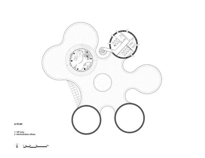 其他功能,譬如展览厅、模型厅、接待厅、办公、后勤用房等被安排在雪晶状平面的外围区域,与中央空间相连接。这使得所有功能都能够均质的排布在中心空间旁,从而提供更多的沟通渠道。
