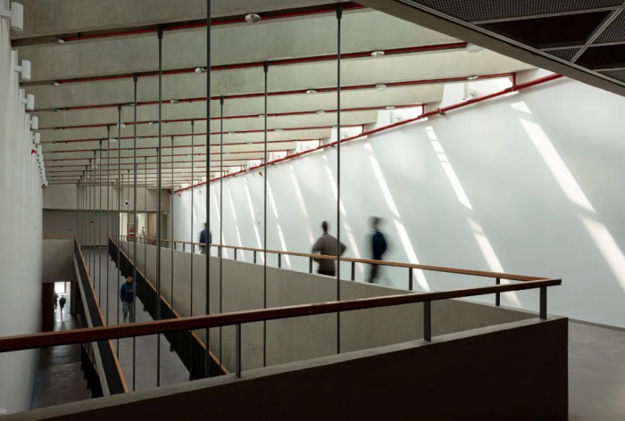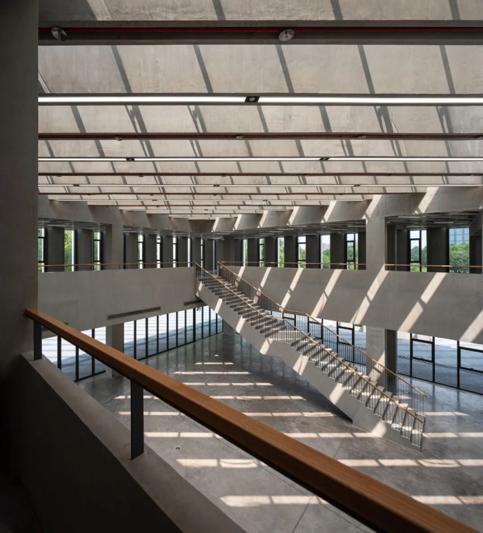 强化建筑与结构 “一体化设计”,建筑近 40.5% 的结构构件采用砼预制装配体系,砼预制密肋梁柱体系与灯具、喷淋、采光、导风等一体整合和展现。设计引入热力学技术,建立流体动力学整体分析模型,主楼采用中庭与热力学烟囱结合,引导主导风垂直贯穿建筑,实现过渡季节最大化自然通风;裙楼公共中庭可在过渡季节实现大面积立面开合和顶部通风。建筑全生命周期整体减少 7% 的碳排放,相当于在嘉定校区种植了 25 万棵树。