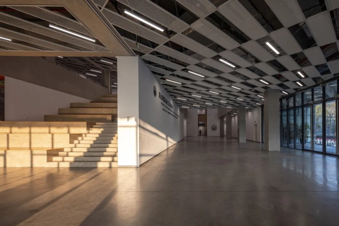 建筑漫游路径同时串接起丰富多样的功能空间,提供一个师生可坐、可躺、可聊、可观、可读、可思、可感、可演的“无边界复合功能空间”。建筑外部采用系统模数控制的磬石般体量,简洁有力,与内部丰富空间形成差异化策略。建筑基础采用整体“浮筑抗震系统”,在基础与地下一层之间设置 2 米层高隔震层,上部构件按设防烈度降低一度设计。
