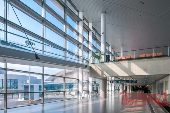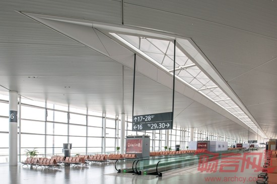 对于指廊候机厅南侧的玻璃幕墙,考虑到采光、视野效果及造价,采用室内遮阳帘。