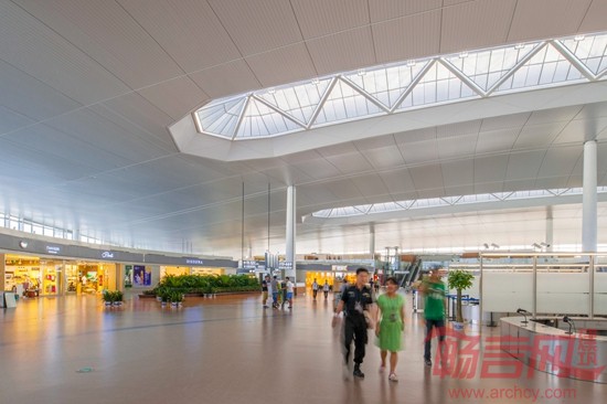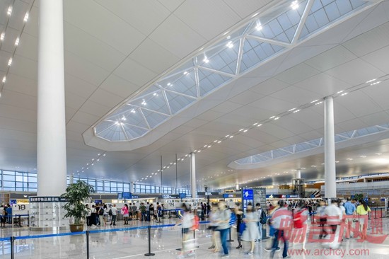 航站楼主楼顶部设置8个采光天窗,两侧指廊中部各设置一条长条天窗;停车楼设置6个采光天井,四周设置开敞下沉庭院,大大改善建筑室内及停车库中部采光效果。
