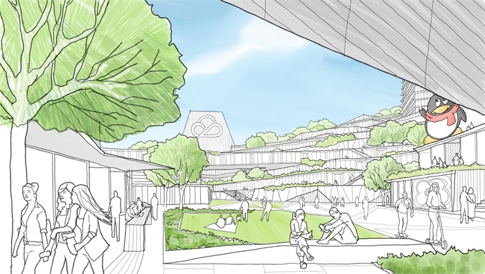 腾讯园区秉承 “以人为本”的理念,从掀起的海浪、连绵起伏的山谷以及腾讯业务固有的互联网特质中汲取灵感,将腾讯园区打造成一座未来的科技之城。设计团队将这些理念转化为城市独有的雕刻般流畅的天际线,并注重人与人、人与自然的联系。