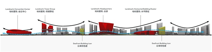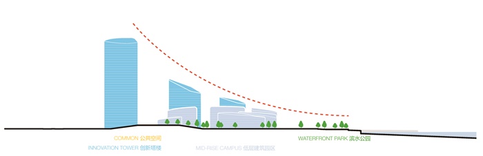 通过实施园区总体规划,由NBBJ主持设计的 04 号地块西区所处的位置,天际线从地块南端总部集群开始缓缓下降,划出一道柔和的曲线,随后在接近北侧相邻的交通导向型开发地块时急速上升。这种天际线上的弧形姿态优化了前海和周边地区的景观视野,同时也清晰明确地勾勒出城市形态和视觉节奏。