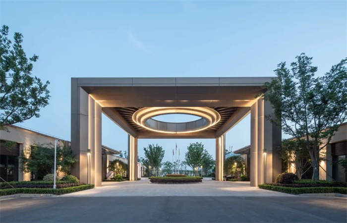 两条轴线的中间交叉点是整个项目的空间和形象焦点,我们在这里设计了一个超尺度的灰空间,担负起整个项目的落客区功能,方中套圆的形态,适度轻奢的材料选择,都比较好地体现了颐养中心作为太湖健康城综合配套中心的地位和作用。