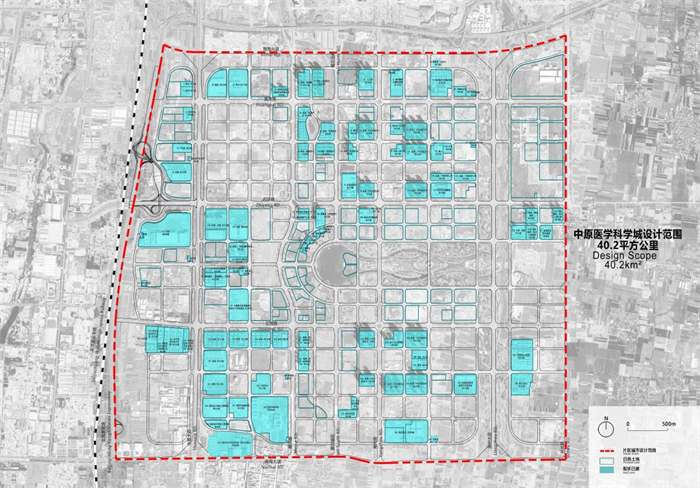 设计团队针对中原医学科学城及其协同区进行了全面设计。规划设计总面积达50.7km²,包括主要设计范围的中原医学科学城(40.2km²)、北部(国际医疗健康园,1.7km²)及东部(生物医药园,8.8km²)的协同设计范围。其中,核心区(约12.3km²)分为两个区域:顺时针由黄海路、双鹤街等围合的区域,面积约9.4km²;由彩鹤街、渤海大道等围合的省医学科学中心所在区域,面积约2.9km²。