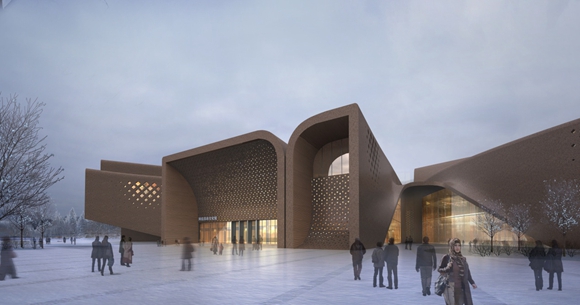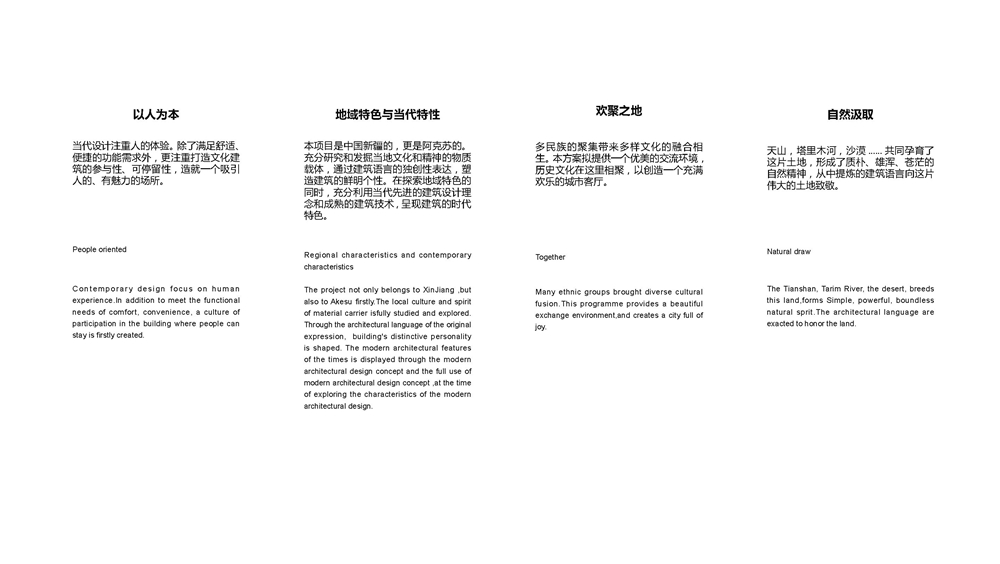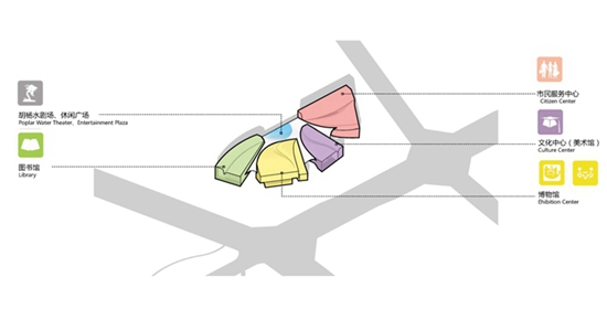 由代表着历史、知识和艺术的博物馆、图书馆和美术馆,以及体现着人本关怀的市民中心,汇聚到象征着”大美和顽强”精神的胡杨林下,组成了盛开的雪莲花,.从城市到场地、从理性到浪漫,从规整的几何体到非线性的空间和体量,最终融合成一个有机的整体.,按各个建筑的功能特点组织的动线系统充分考虑了现代展示技术的应用,以期为观众带来全新的使用体验.丰富的形态结合了取自阿克苏白水河里的水刷石材料,建筑立面谨慎地开窗处理充分考量了新疆阿克苏干热气候的特点.也使建筑显得内敛、神秘而又浪漫。