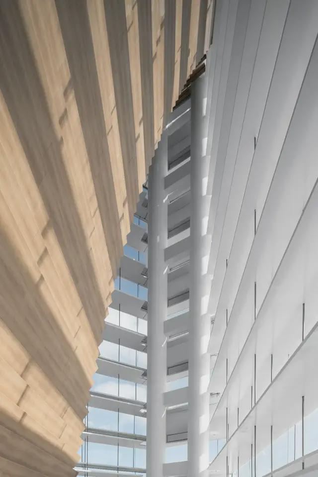 九个空中中庭分别位于建筑中段的三个不同方向和不同的高度,员工不仅可以在这里工作交流,更能从三个方向上俯瞰港区全景、远观青岛整体风貌、欣赏大海的壮丽景色。中庭空间采用索网幕墙,考虑到幕墙的统一设计,同样延续了整体幕墙的水平线条,并保证了大空间的充足采光。空中中庭为使用者提供了健身、休憩、交流、观景等多功能大空间,凸显和提升了大厦办公空间的品质和特色。