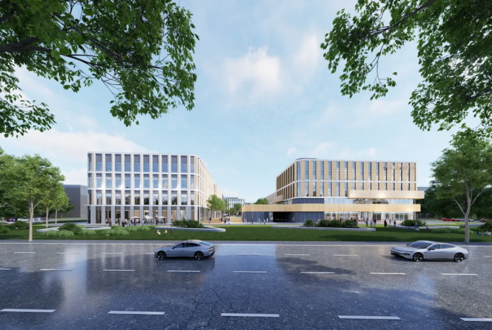进入园区,中央景观轴串联展示中心、办公研发区与生活配套,形成开放且有导向性的动线。