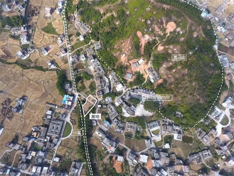 基地西南侧有小河,河的南侧是半月塘和祠堂;西北侧有山景,视野开阔;东侧的村路是进入场地的重要道路,村路与场地之间是一片狭长的绿地,绿地内有两棵大树和一排竹子,再往东就是中山纪念小学。