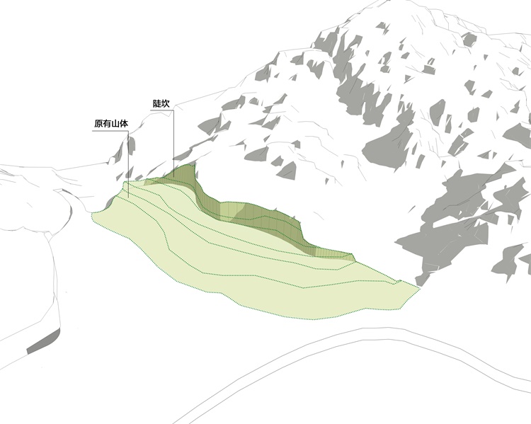 在此基础上,设计团队提出“折叠的水平线”的设计理念:建筑总体呈退台式组织,暗示了建筑作为另类等高线与山体的关系,建筑作为自然环境的一种延续,但又不仅限于对自然的模仿和拟态。