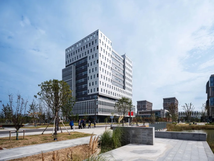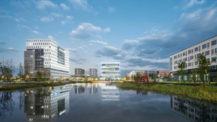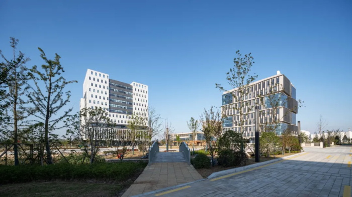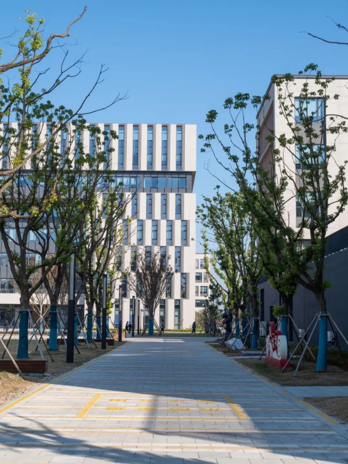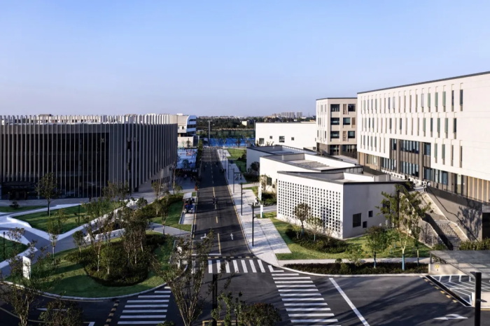 资源共享的一体化校园:中、高职共处一个校园,校园规划以湖为核、以水为脉、以园为实,共享公共实训中心及体育中心及核心景观,形成一体化的职业教育中心。共享实训资源区设置于中、高职园中央,涵盖公共实训中心及预留教学实训、配套设施。