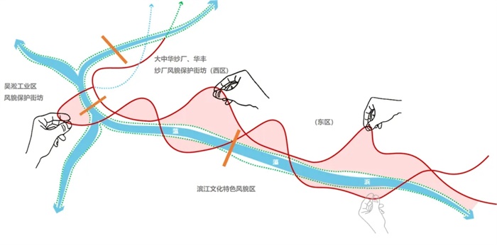 △ 10公里的“DNA双螺旋线步道”(滨水公园步道+超级街区)串联西区文创园区和东区科创园区, 不同系统的功能空间互联互通,形成活力科创社区的三大磁极。