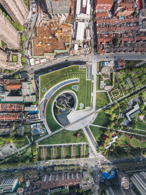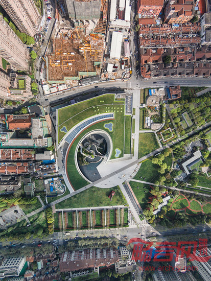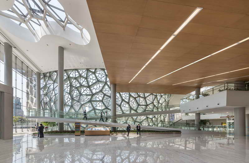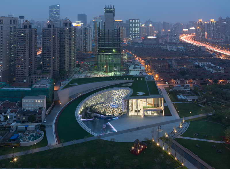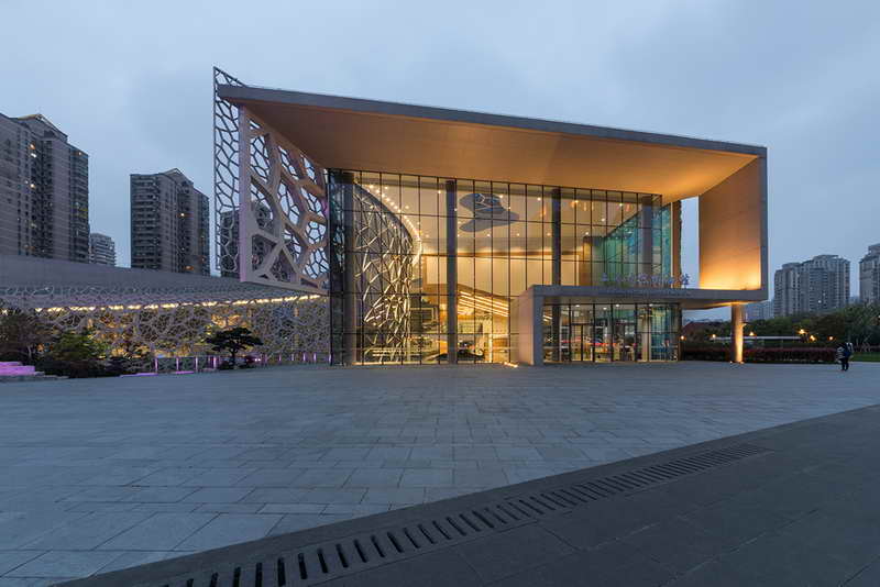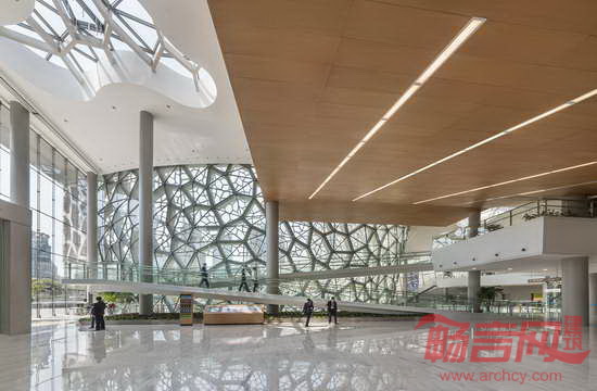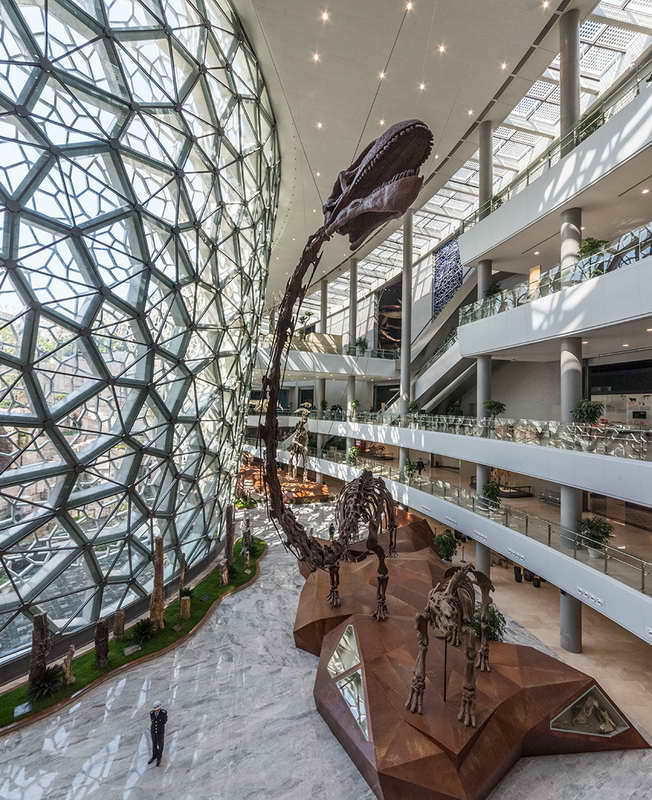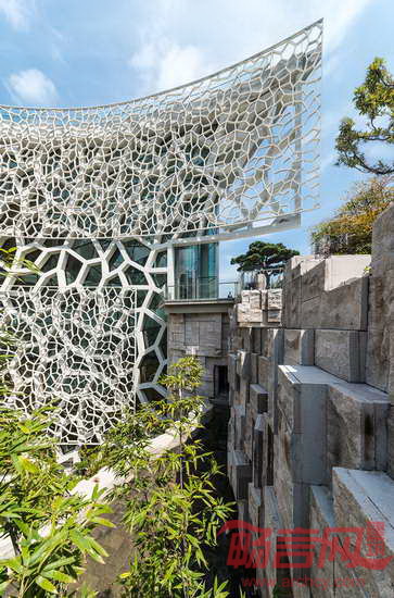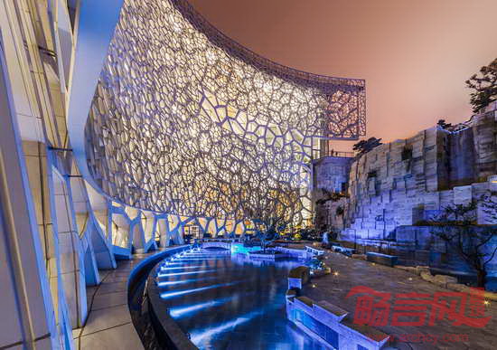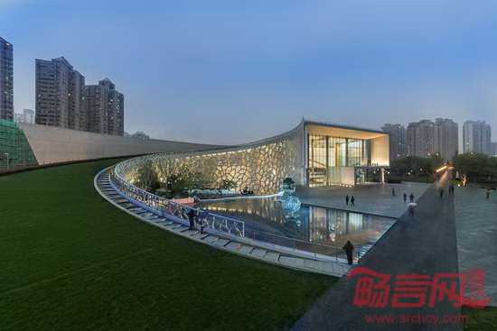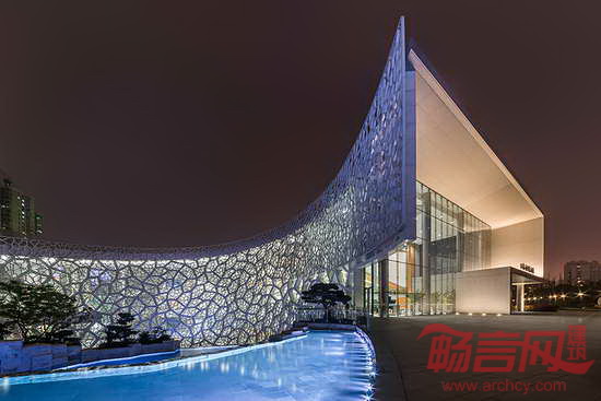 馆体螺旋式的外形使人不禁联想到自然界最纯粹的几何形态 – 鹦鹉螺壳。螺旋体环抱一湾池水,池水与展馆细胞墙之间由叠式庭院联系在一起。设计从中国传统园林汲取灵感,以竖向的方式铺展开一幅动态的中国山水画。庭院内假山跌宕,流水潺潺,既丰富了室内公共区域的视野,又成了室内的访客的主要的方位指针。