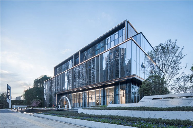 建筑不仅是城市的文化场所,同时为新城金郡项目提供最好的展示空间。建筑的入口区、沙盘展示区与内庭景观的空间均采用通透材质划分,使室内空间可以一直延伸至外部庭院,室内结合悬挑玻璃砖和吊顶波纹不锈钢板将建筑内外的山水意向联系起来,延续自由灵动、自然雅致的空间主题。