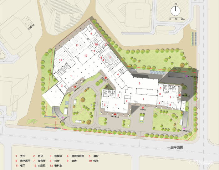 主体功能以科研办公为主,在裙房内配套展厅、报告厅、餐厅&食堂、大会议室、等候区、贵宾接待室、资料室等辅助用房,通过过厅和富有序列感的廊道串联起三座塔楼。充分满足各楼座的办公和重型企业的技术交流等要求。