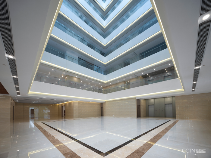 建筑室内与室外浑然一体,简洁稳重的体量既是外部形象的呈现,同时也延续到建筑内部空间。室内功能与建筑形制完美融合,“创新思维、国际化现代办公环境”满足未来更快发展蓝图。前厅、廊道、中庭等体量之间的空间曲折多维穿插,营造出丰富的空间效果,形成良好的科研办公、会议等环境,同时在每个塔楼及各出入口处均设置有休息空间、等候区供人停留。