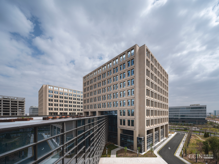 二、三层设有办公、会议室、实验室、档案室及室外走廊等高品质的办公环境,并在裙房顶配有景观绿化、休闲小憩的空间;餐厅上方屋顶还配有篮球场;种种人性化的设计贯穿整个项目。